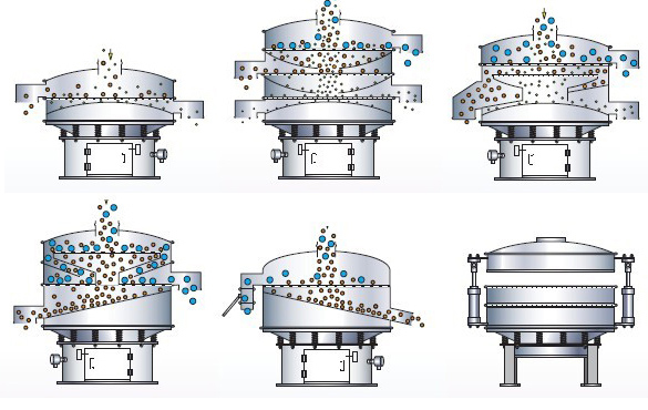 采用立式振動電機作為激振源,通過振動電機上下兩端的偏心重錘將旋轉運動轉變為水平、垂直、傾斜的三次元運動,并傳遞到旋振篩的篩面上;物料通過入料口進入設備內,根據不同物料篩分要求,物料經過1-5層采用不同目數的金屬編織篩網的篩分層,在這個過程中,位于各層的篩網下的清網裝置(硅膠彈跳球)通過頻率振動不斷撞擊篩網,使篩網上層物料能夠順暢的透網篩分,并有效解決了物料堵網問題出現,不同目數的物料通過各層對應目數的篩網后在各層的出料口排出,終實現篩選除雜或過濾分級的目的。