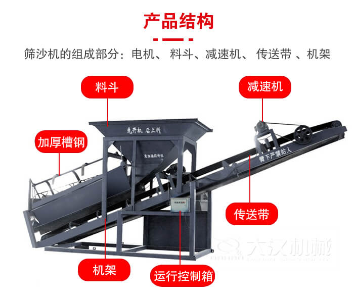 篩沙機(篩沙船)的組成部分:電機、 料斗、減速機、 傳送帶 、機架、 轉(zhuǎn)篩、 傳送桿 。