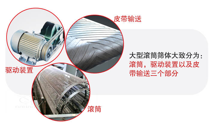大型滾筒篩體大致分為:滾筒,驅(qū)動裝置以及皮帶輸送三個部分,產(chǎn)品的結(jié)構(gòu)比較簡單,維修方便。