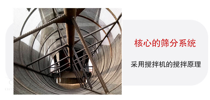 其核心的篩分系統(tǒng)采用攪拌機的攪拌原理,原料在攪拌筒內(nèi)受連續(xù)螺旋葉片翻滾、推擠及物料間相互磨擦作用,作用強烈可靠性高。