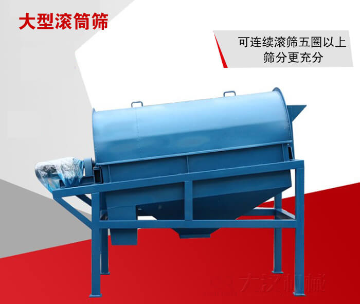 大型滾筒篩的工作原理主要是仿照人工利用斜面篩網(wǎng)篩沙的工作原理,大型滾筒篩采用平置滾筒安裝能夠保證料流在滾筒的多圈螺旋葉片間,可連續(xù)滾篩五圈以上,能夠達到物料反復(fù)翻滾,滑動而充分離散,分離。