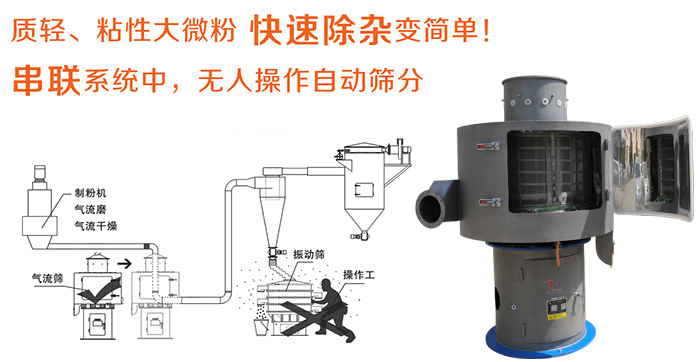 3、產量大:可與各種磨機,風路并網配套使用,臺時產量是振動篩的5-10倍或更高。