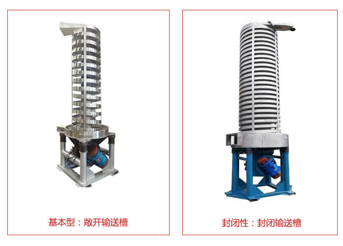 螺旋垂直振動提升機DZC系列垂直振動輸送機的驅動裝置振動電機安裝在輸送塔下部,兩臺振動電機對稱交叉安裝,輸送塔由管體和焊接在管體周圍的螺旋輸送槽組成,輸送塔座于減振裝置上,減振裝置由底座和隔振彈簧組成。當垂直輸送機工作時,根據雙振動電機自同步原理,由振動電機產生激振力,強迫整個輸送塔體作水平圓運動和向上垂直運動的空間復合振動,螺旋槽內的物料則受輸送槽的作用,作勻速拋擲圓運動,沿輸送槽體向上運動,從而完成物料的向上(或向下)輸送作業。
