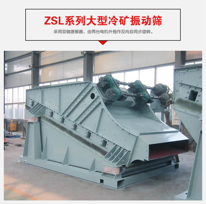 ZSL系列大型采用雙軸激振器,電機不參振,由兩臺電機外拖作反向自同步旋轉,使篩箱產生較大振幅沿直線方向作周期性往復運動,從而達到篩分目的的一種振動篩設備。這種振動篩具有生產能力大、工作可靠、振幅調節方便、傳給基礎的動負荷小等優點。