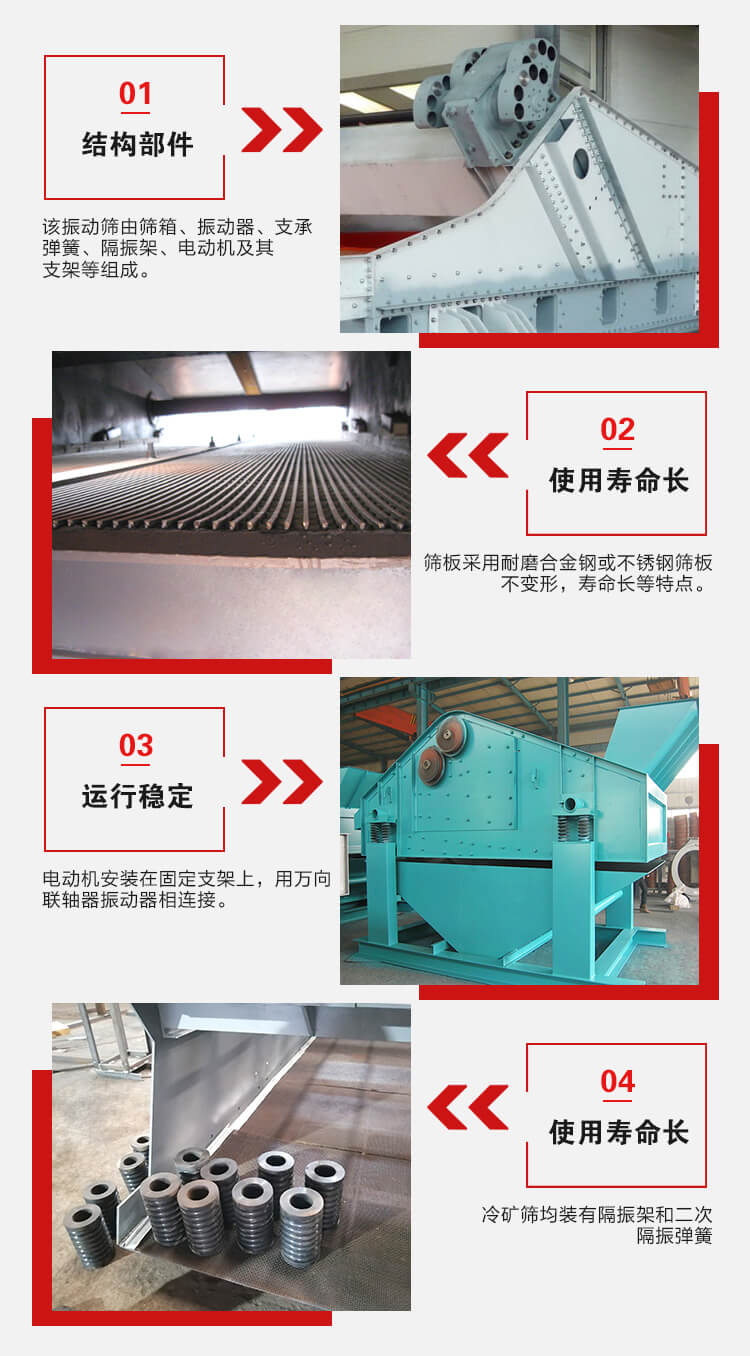 該系列振動篩由篩箱、振動器、支承彈簧、隔振架、二次隔振彈簧、電動機及其支架等組成。